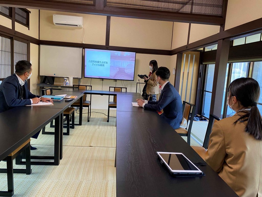 八日市まちづくり公社の方とはその活動の中でお出会いし、実際に八日市駅周辺で様々なイベントを行っていることを知りました。今回の連携授業では3学期に作成したプレゼンを八日市まちづくり公社の方にも聞いていただき、アドバイスやイベントを企画するために必要な視点についてお話ししていただきました。
