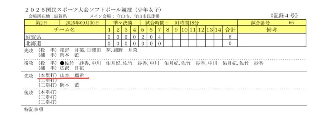 9月29日から滋賀県で行われた「わたSHIGA輝く国スポ2025」少年女子ソフトボール競技に、本校生徒も代表選手として出場しました。滋賀県チームは準々決勝を勝ち抜き、準決勝で兵庫県と対戦。互いに譲らぬ熱戦の末、9回タイブレークで惜しくも敗退しました。試合を通じて最後まで全力で戦う姿に、会場から拍手が送られました。なかでも本校3年1組の山本瑠希選手は、見事なランニングホームランを放ち、チームを大いに盛り上げてくれました。