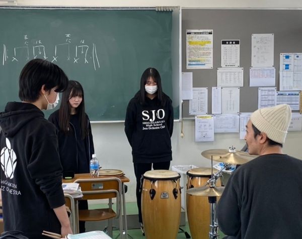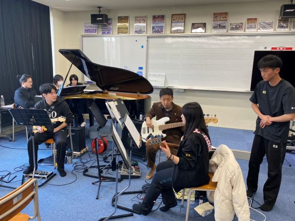 2月21日(土)、来月のコラボステージに向けて、プロのジャズ奏者「田中洋一×西村有香里クインテット」の皆さんが、滋賀学園高校に来てくださいました。