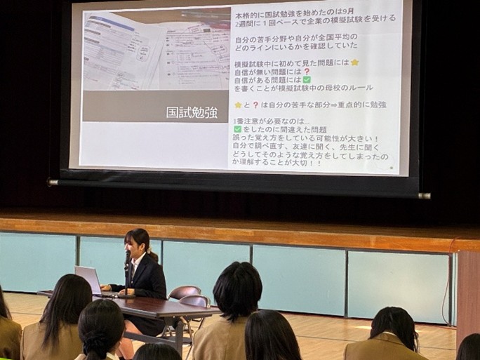 県外の看護科・看護専攻科5年一貫校を卒業された先輩であり、実際の学校生活や看護師国家試験の勉強方法をお話していただきました。生徒たちは、今後の学習進度や勉強方法のイメージを持つことができ、とても有意義な時間となりました。